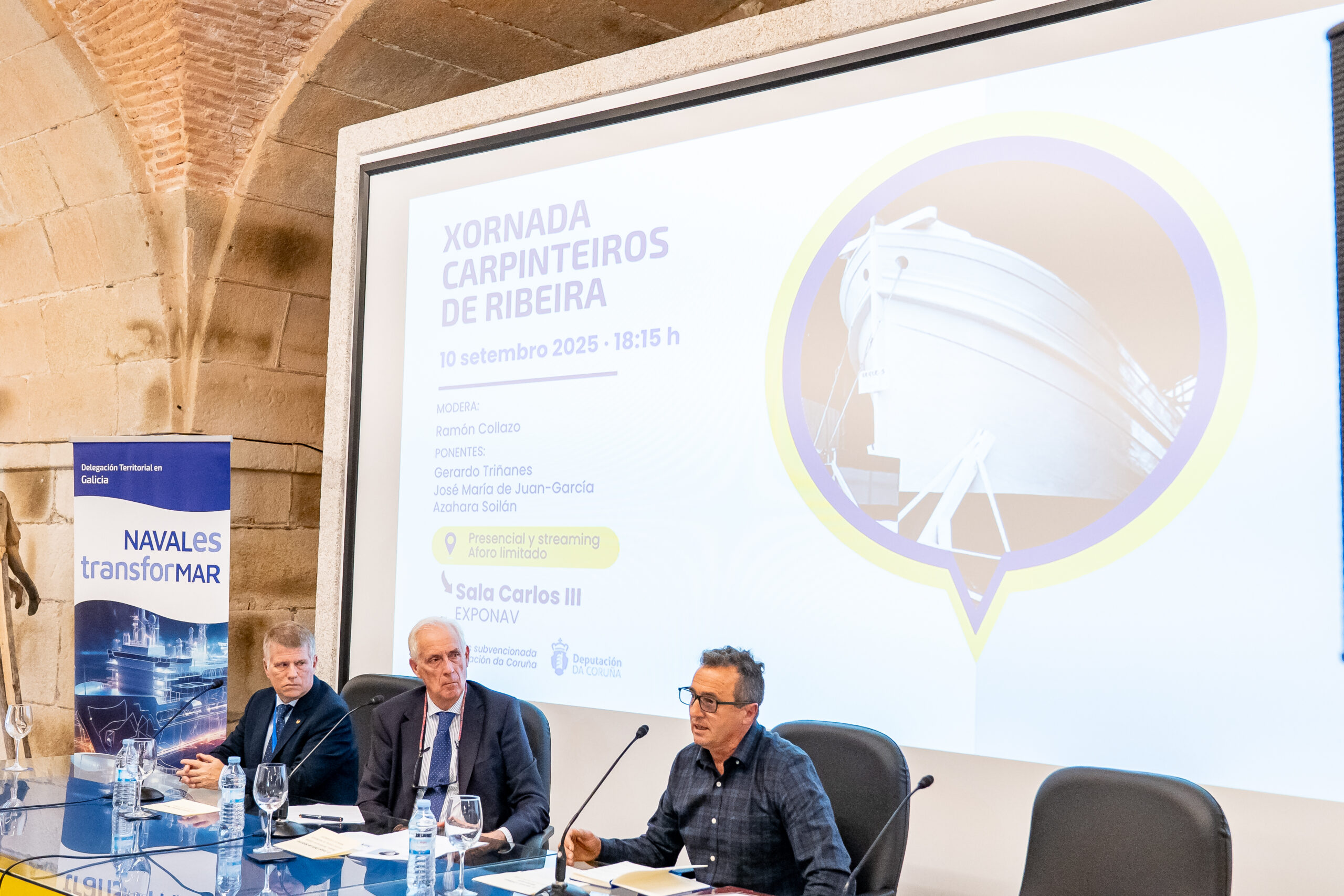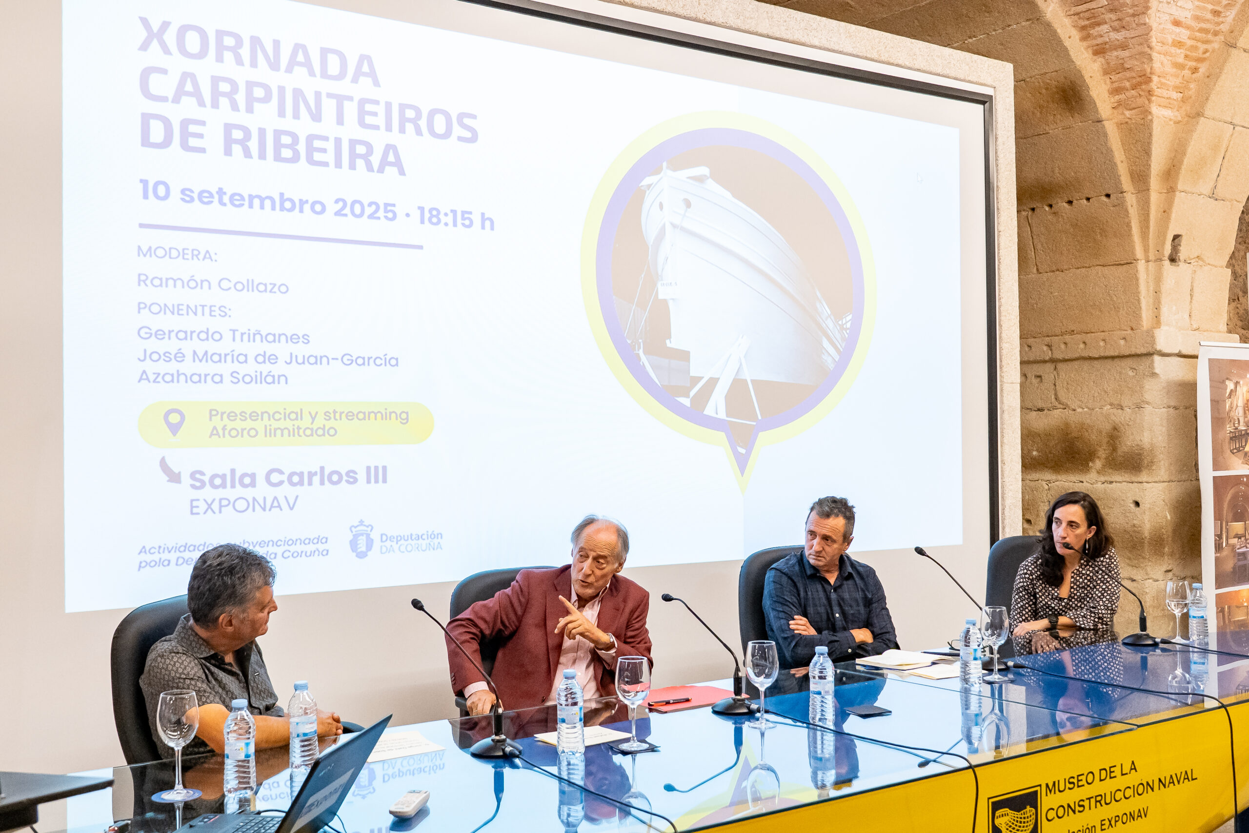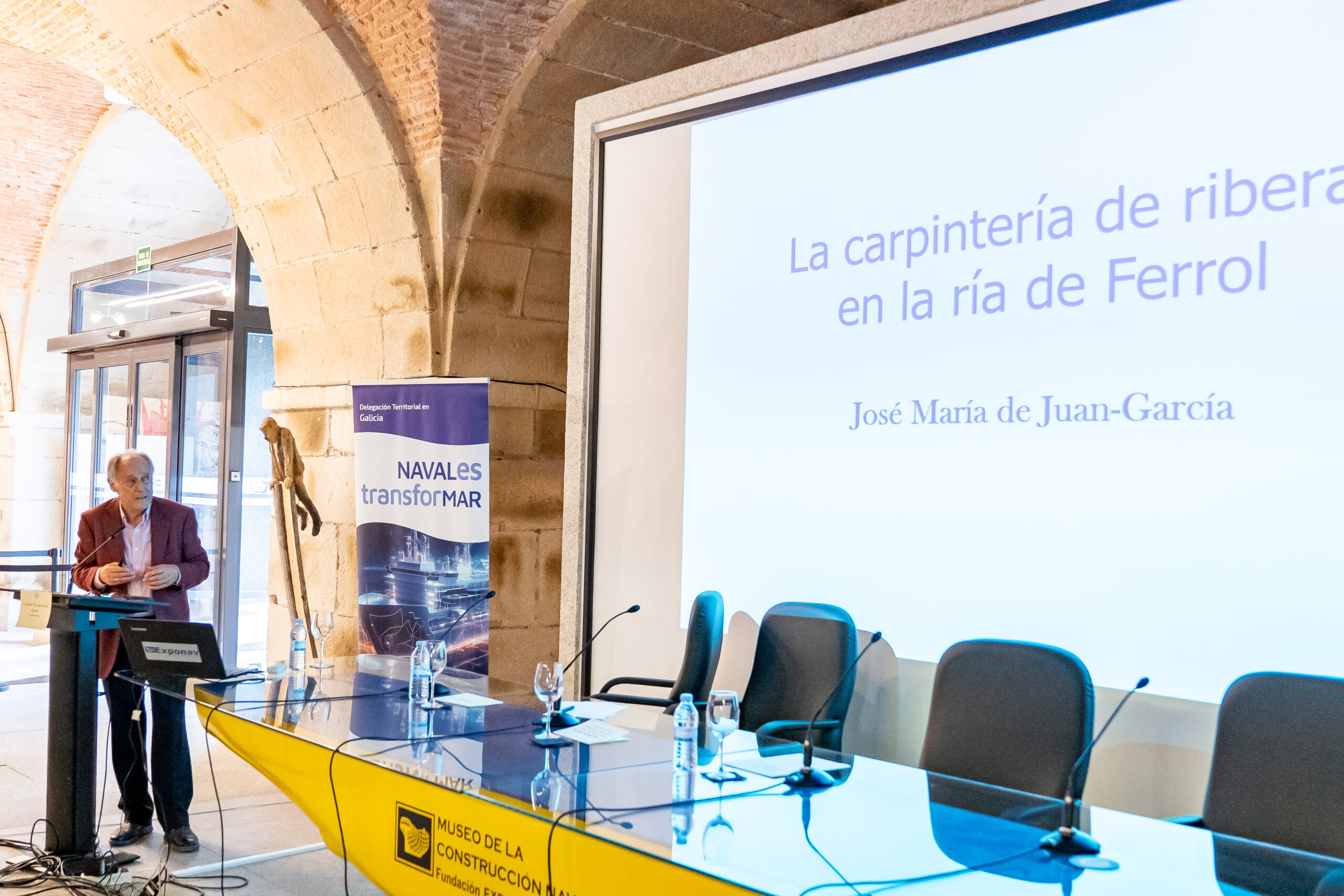 José María de Juan-García, Doutor Enxeñeiro Naval,  iniciou o seu relatorio “A Carpintería de Ribeira na Ría de Ferrol na historia a Carpintería de Ribeira na Ría de Ferrol”, sinalando as dúas frontes nos que se desenvolvía a construción naval en madeira nos séculos XIX e XX en Galicia. Por un lado, os estaleiros, que construían baseándose en planos, tiñan unha plantilla estable nos diferentes gremios e realizaban os montaxes mecánicos nos seus talleres e cos seus propios medios, e por outro a Carpintería de Ribeira artesanal que traballaban en galpóns ou incluso na súa casa, baseándose en medios modelos do casco, rexíase polo sistema de traballadores autónomos e os montaxes realizábanse por talleres mecánicos alleos.