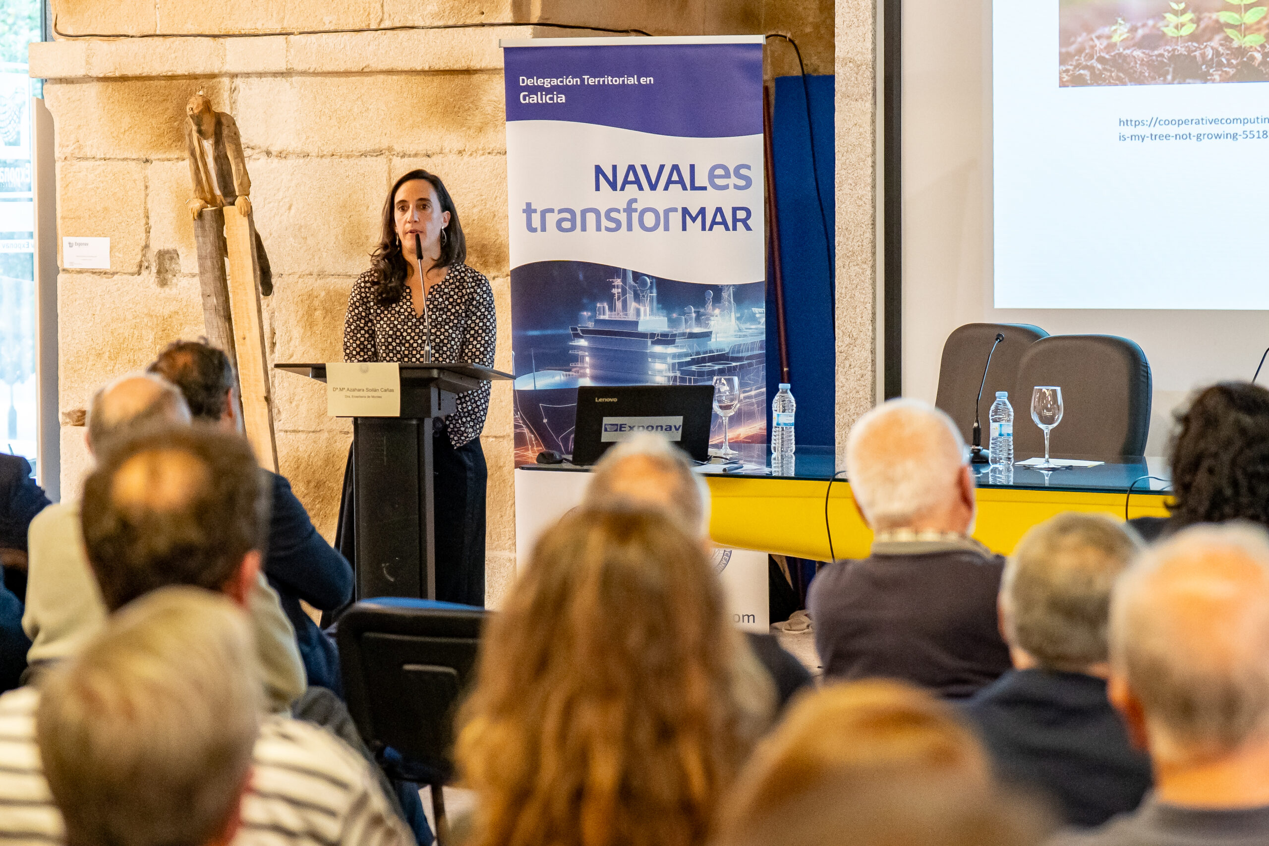 Azahara Soilán, Doutora Enxeñeira de Montes centrou o seu relatorio “A Madeira na Construción Naval”, nas características da madeira como material, facendo un repaso polas propiedades físicas e mecánicas que caracterizan o seu comportamento como material estrutural e que a fan idónea para a súa utilización na construción naval. Asimesmo, Azahara repasou as particularidades das especies locais máis empregadas na “Carpintería de Ribeira”, así como aqueles aspectos que condicionan o éxito na súa utilización. Ademais, a presentación abordou outros aspectos da fabricación de produtos derivados da madeira, coa durabilidade e a pegada ecolóxica dos materiais.