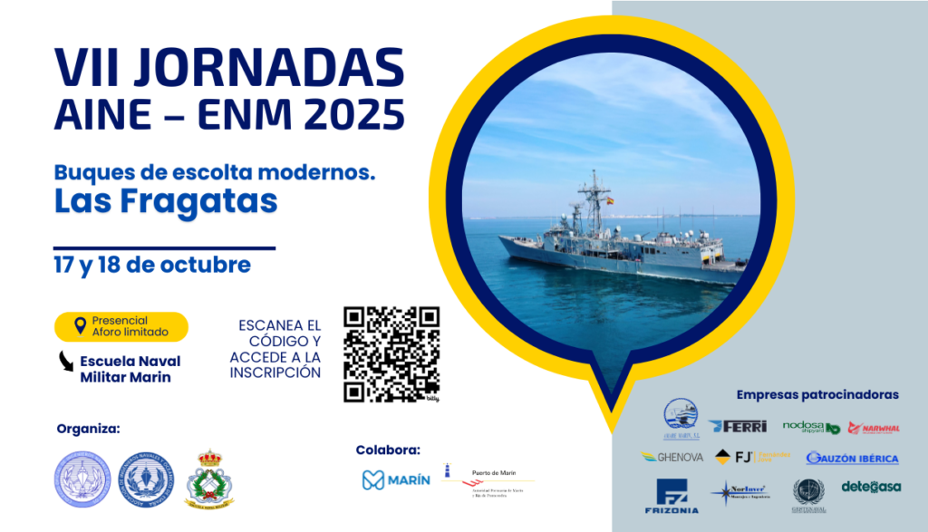 Los próximos 17 y 18 de octubre, tendrá lugar la séptima edición de nuestra Jornada Técnica AINE-ENM, este año con el título «Buques de escolta modernos. Las Fragatas».