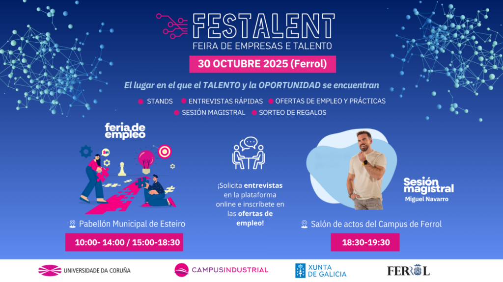 FESTALENT, la Feria de Empresas y Talento organizada por el Campus Industrial de Ferrol (Universidade da Coruña), busca conectar a las empresas con el talento universitario y con aquellas personas en busca de nuevas oportunidades profesionales. Durante la feria de empleo, que se celebrará en el Pabellón Municipal de Esteiro, los asistentes podrán participar en actividades que faciliten su transición al mundo laboral, interactuando directamente con líderes en sus sectores en sus stands, informarse de los perfiles que están demandando y presentando su talento en las entrevistas rápidas que tendrán lugar durante la feria.